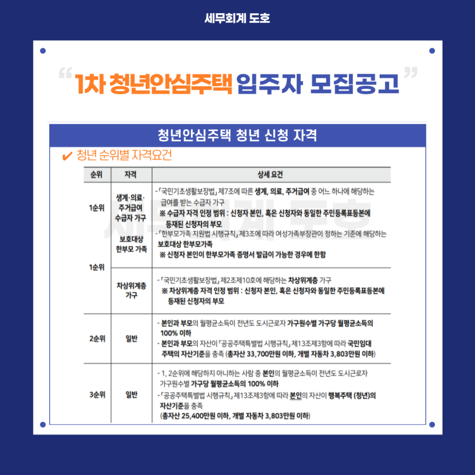 - 3순위 : 도시근로자 평균소득 100% 이하 + 자산 2억 5,400만 원 이하