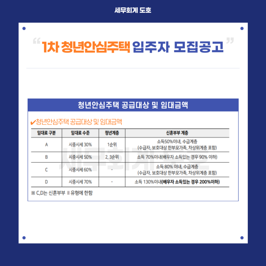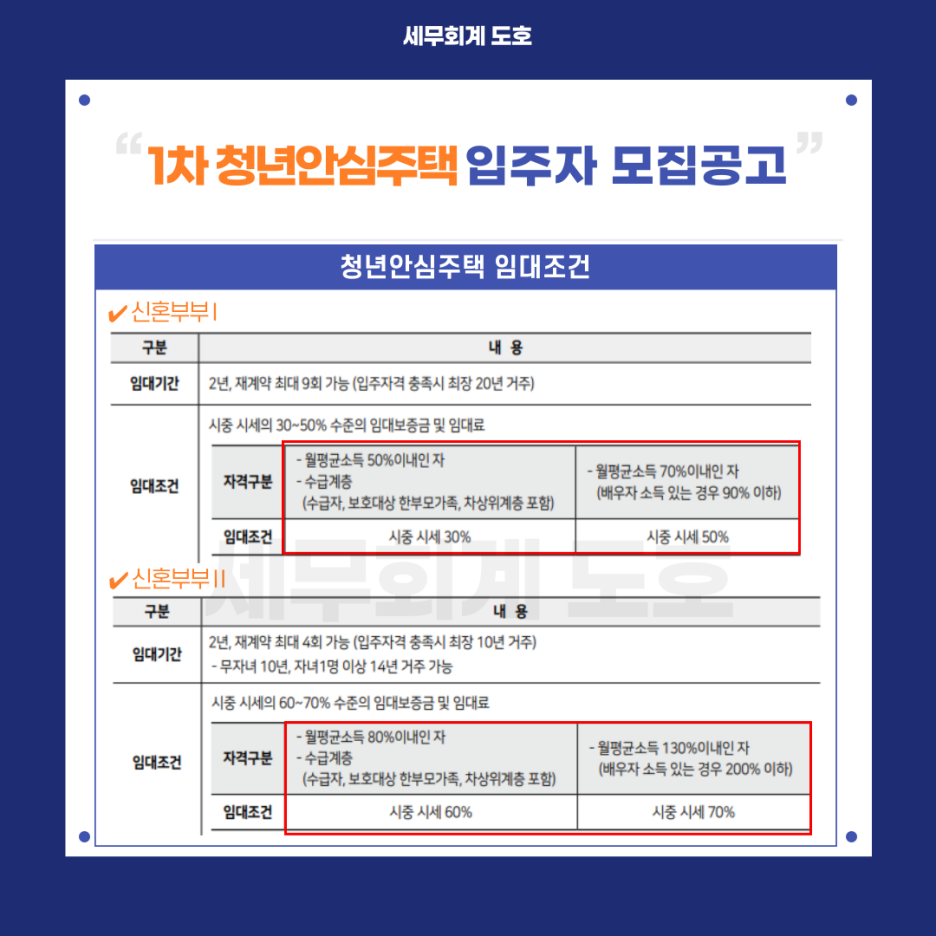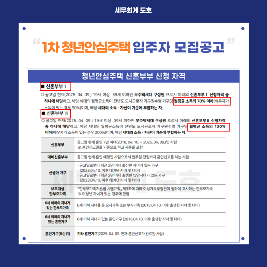 - 월평균소득 70% 이하 (배우자 소득 있으면 90% 이하)