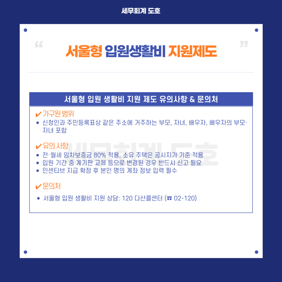 - 서울형 입원 생활비 지원 상담: 120 다산콜센터 (☎ 02-120)